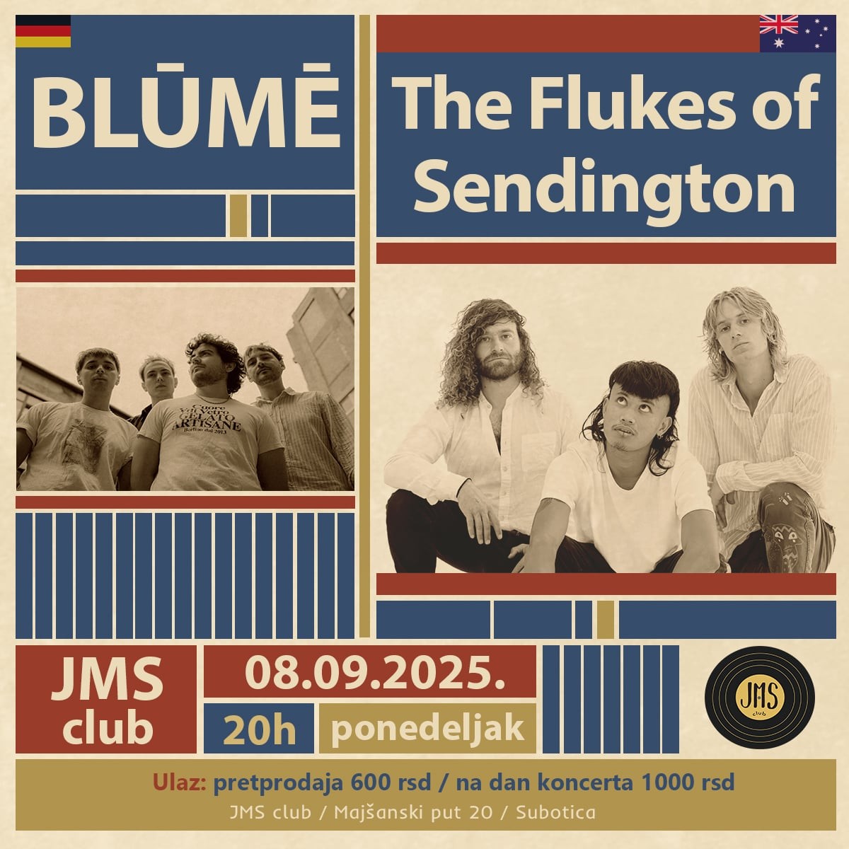 Australijski rok bend iz Bajron Beja konstantno gradi sopstvenu reputaciju na sceni kao jedan od najvrednijih DIY i nezavisnih bendova, sledeći stope drugih DIY velikana kao što je King Gizzard and the Lizard Wizard. Od svog osnivanja početkom 2024. godine, već su uspešno okončali evropsku turneju iste godine i stekli verne fanove gde god da su išli. Osnovani početkom 2024. godine, bend Flukes of Sendington je visceralan, glasan i energičan. Njihov zvuk lebdi kroz kosmos, spajajući zvuke garažnog roka, fanka, psihodelije i indi muzike sa modernim elementima. Uspešno su završili evropsku turneju iste godine gde su nastupali na festivalima Vierdaagsefeesten (Najmegen), Vogelpop i Munich Summer Sessions i stekli željne fanove gde god da su išli svojim neumornim pogonom i snažnom odlučnošću da uspeju.