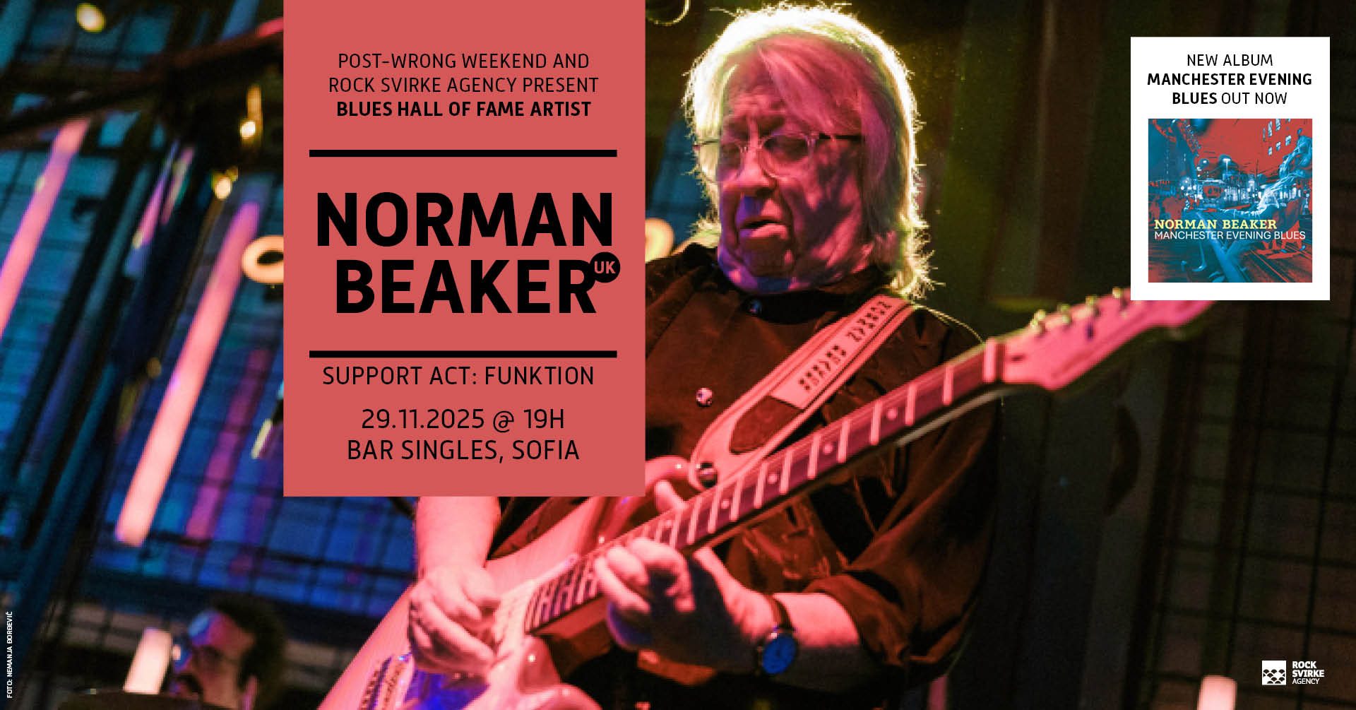 Норман Бийкър (1950, Манчестър), чието име преди няколко години (2017) беше вписано в “Залата на славата на блуса” в Сан Диего, Калифорния, е едновременно колос на тази музика, която през последния половин век и повече наричаме „британски блус“ и неуморен пътешественик, за когото голямата световна сцена и малките клубчета из Балканите са еднакво важни.